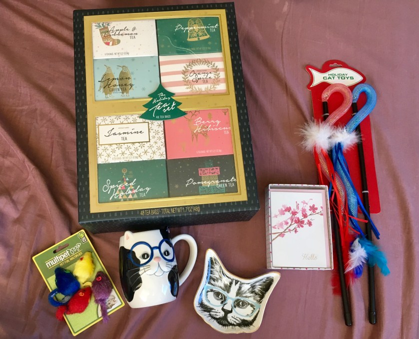 She got me a cat mug and a matching jewelry dish. I have been looking for the perfect thing to hold my favorite rings and earrings for months, and she got it! She sent me two other favorite things of mine: stationery and tea!